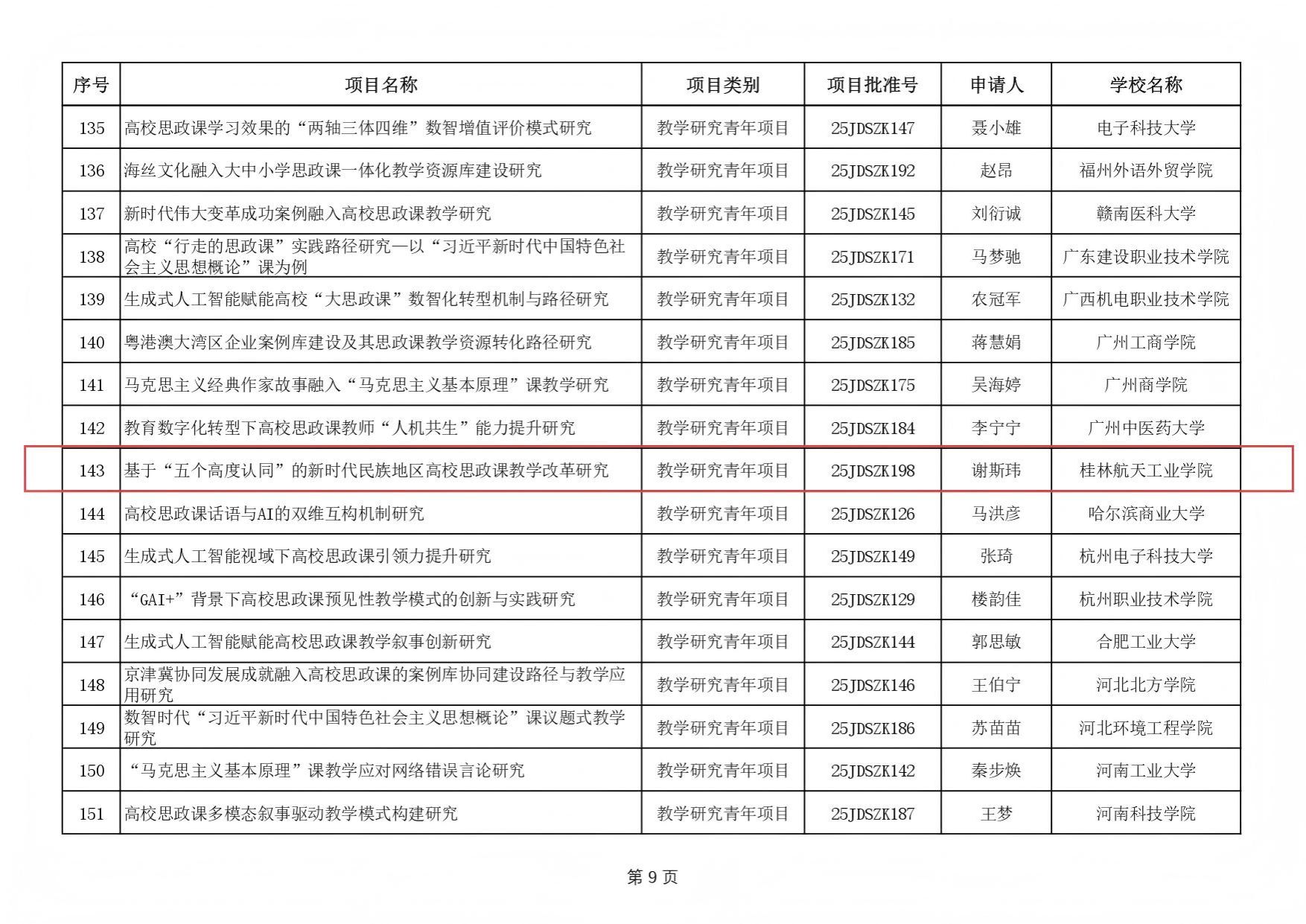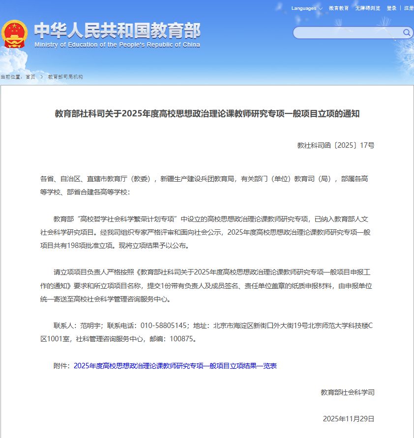 近日,教育部社科司发布了2025年度高校思想政治理论课教师研究专项一般项目立项通知,马克思主义学院教师谢斯玮申报的《基于“五个高度认同”的新时代民族地区高校思政课教学改革研究》获批立项。据悉,本次教育部高校思想政治理论课教师研究专项一般项目全国共有198项批准立项。此次立项,是学校深入落实立德树人根本任务,积极推动思政课建设内涵式发展的重要体现。