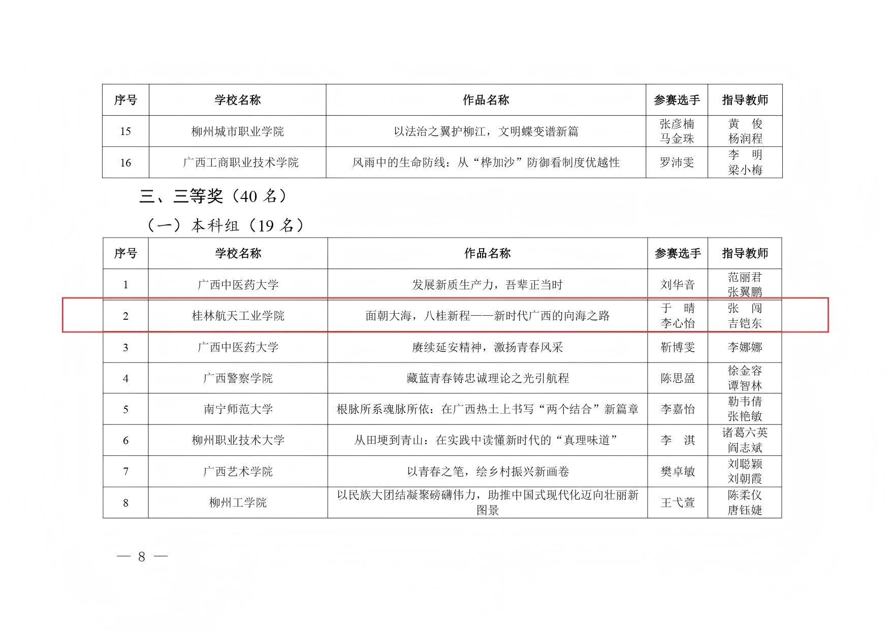 近日,自治区党委教育工委、自治区教育厅公布了全区高校大学生党的创新理论宣讲大赛获奖名单,我校学子凭借扎实的理论功底和精彩的宣讲表现,斩获一等奖2项、三等奖1项。此次获奖,不仅展现了桂航学子的卓越风采,更彰显了学校思想政治教育工作的扎实成效。